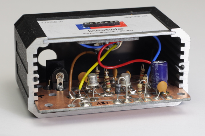 Het eindresultaat staat hieronder afgebeeld. Met een stekker voeding wordt er 12VDC aangevoerd waarop de tester werkt. Door er een kristal in te drukken komt er uit de BNC connector aan de achterkant een signaal dat bekeken of gemeten kan worden met respectievelijk een scoop of een frequentieteller. Alles bij elkaar kost de tester vrij weinig en is eigenlijk van "junkbox" componenten te bouwen. Er is ook nog een sticker opgemaakt op de computer en op schaal geprint. Zo zijn de aansluitingen duidelijk herkenbaar en het staat ook nog netter.